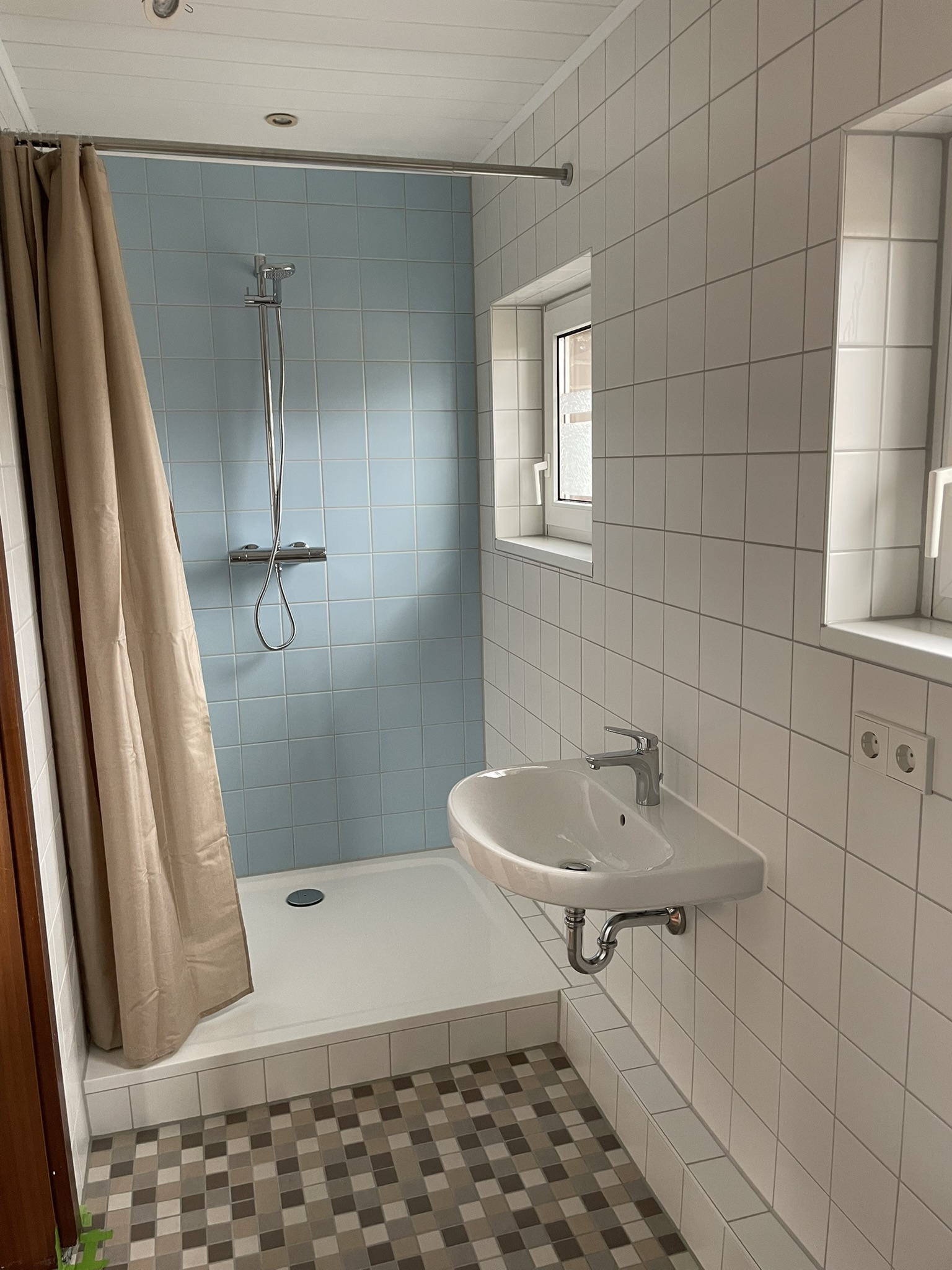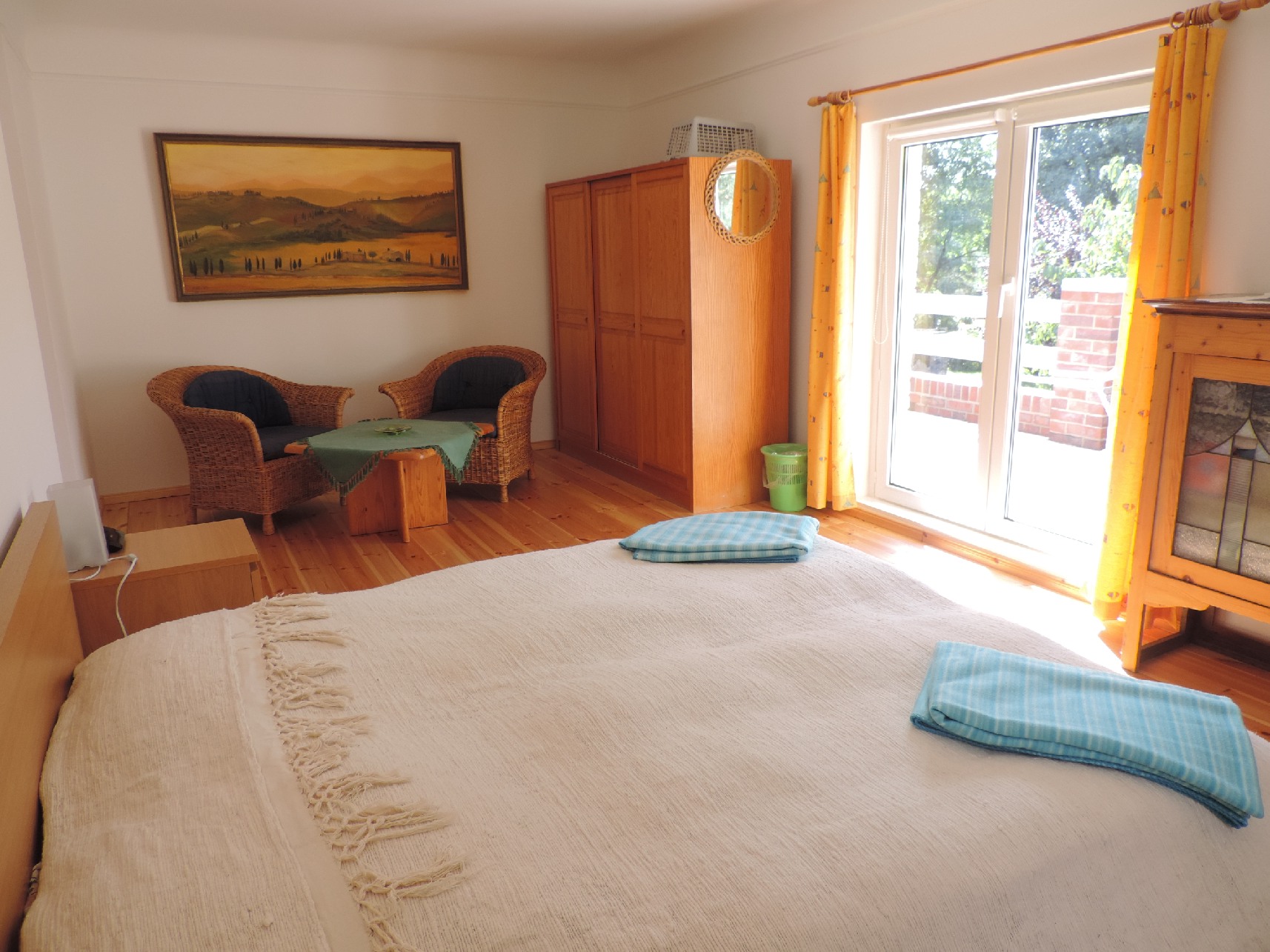 Das Fenster und eine große Balkontür lassen viel Licht in den Raum (Ausstattung mit Rollos zur Verdunkelung). Von hier aus gelangen Sie auf den Balkon, der einen Blick auf die benachbarten Gärten und die Landschaft eröffnet und bei gutem Wetter zum Sonnenbad einlädt.